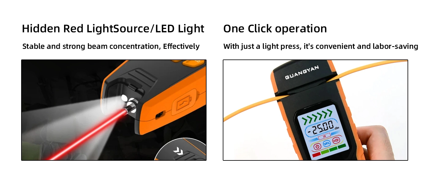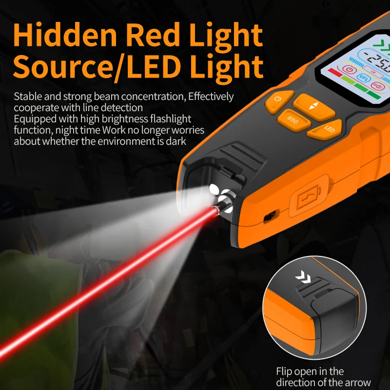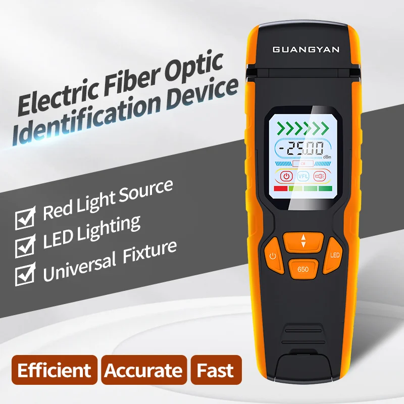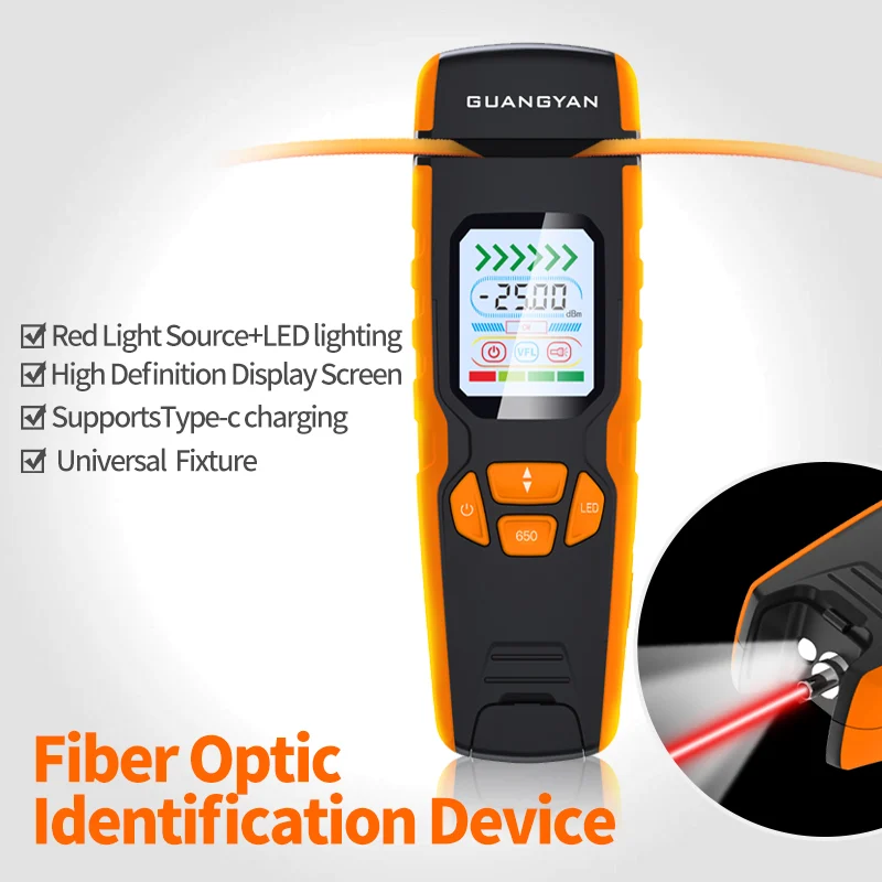 This electric fiber optic identification device integrates hidden red light source, high-brightness LED, and micro-bending testing technology. Designed for quick on-site fiber identification and signal frequency detection, it supports one-click operation, multiple charging methods, and universal cable compatibility, making it ideal for professional fieldwork.