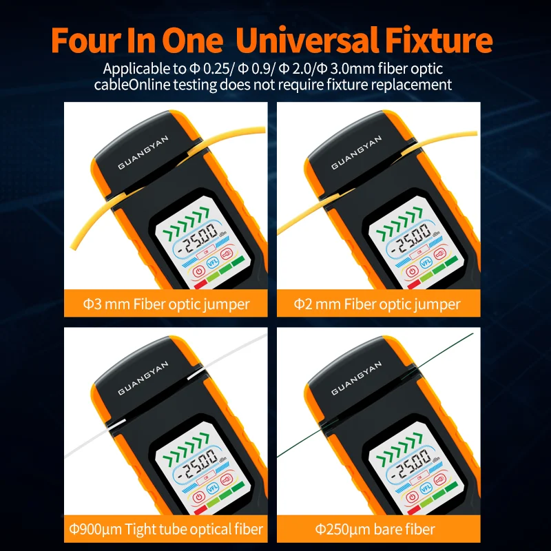 - Compatible with 0.25/0.9/2.0/3.0mm optical fibers without changing fixtures;