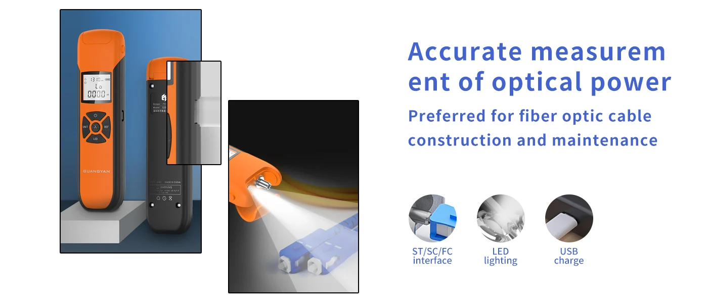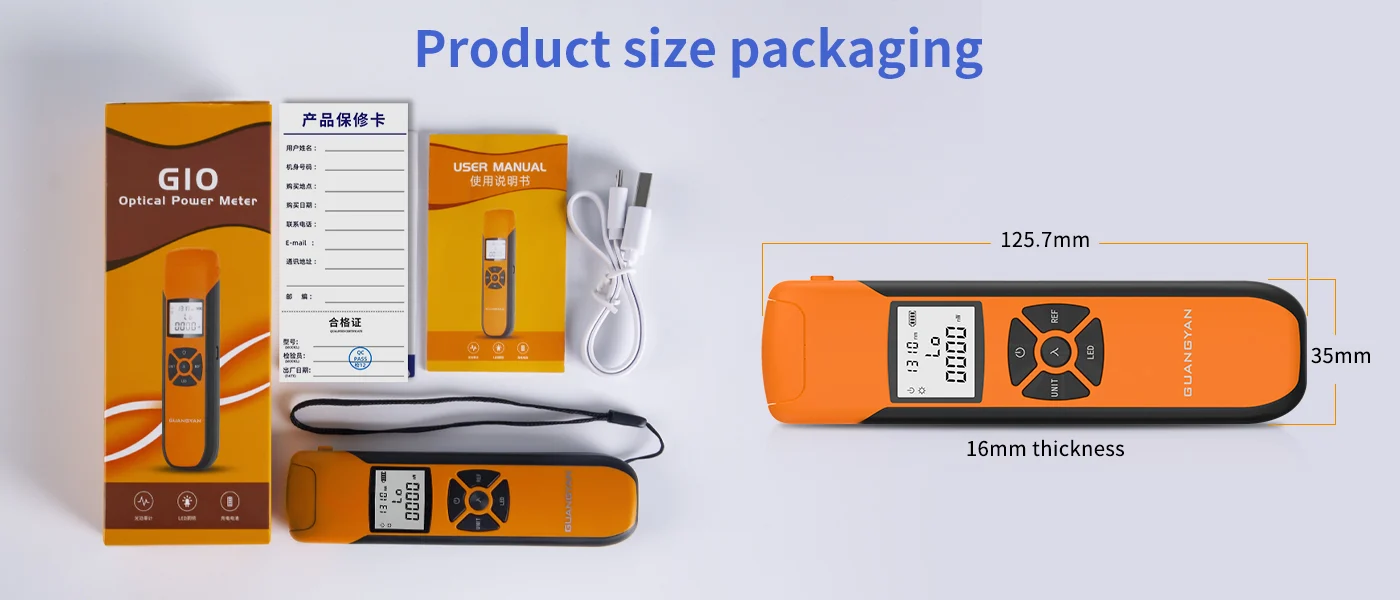 This compact optical power meter supports seven test wavelengths and features a high-definition digital display with dual backlight modes. Designed with a pop-up protective cover and built-in LED flashlight, it’s suitable for a wide range of work environments. The USB direct charge function and intelligent wavelength memory enhance usability for on-site testing.