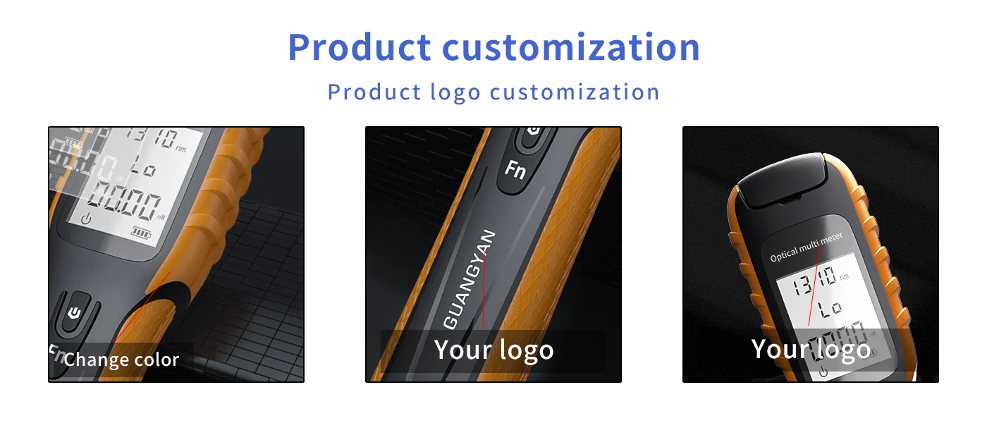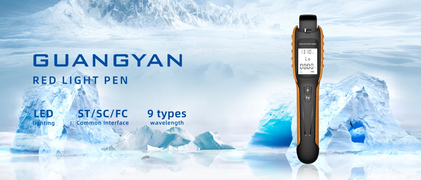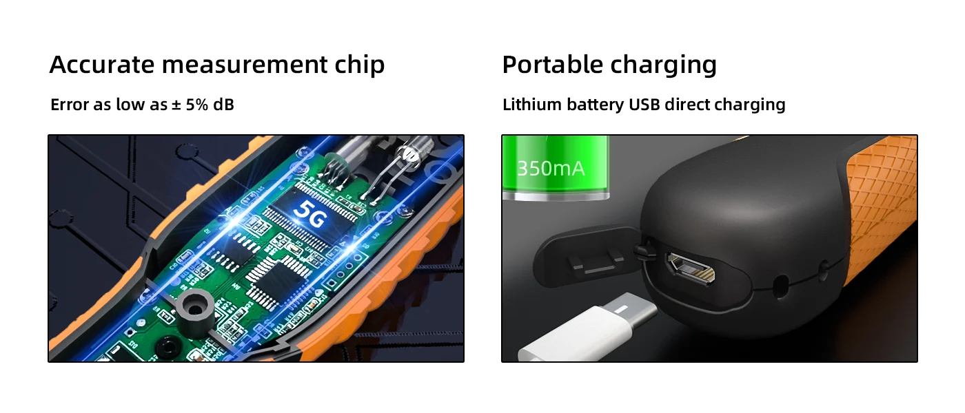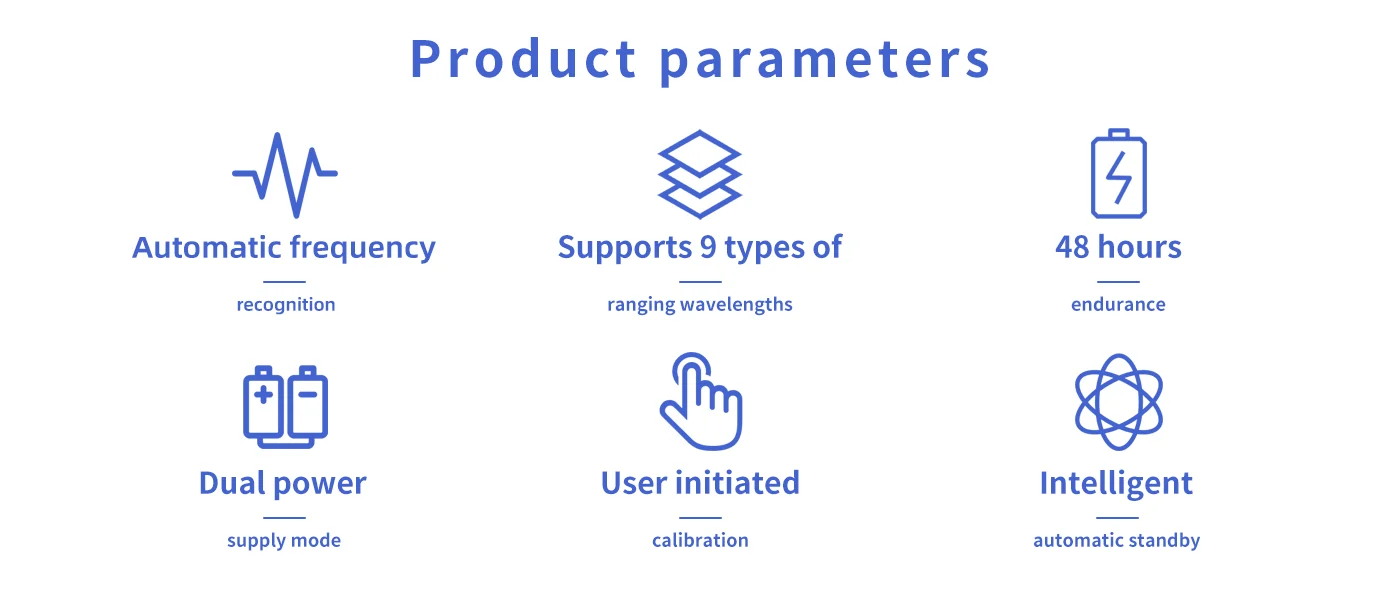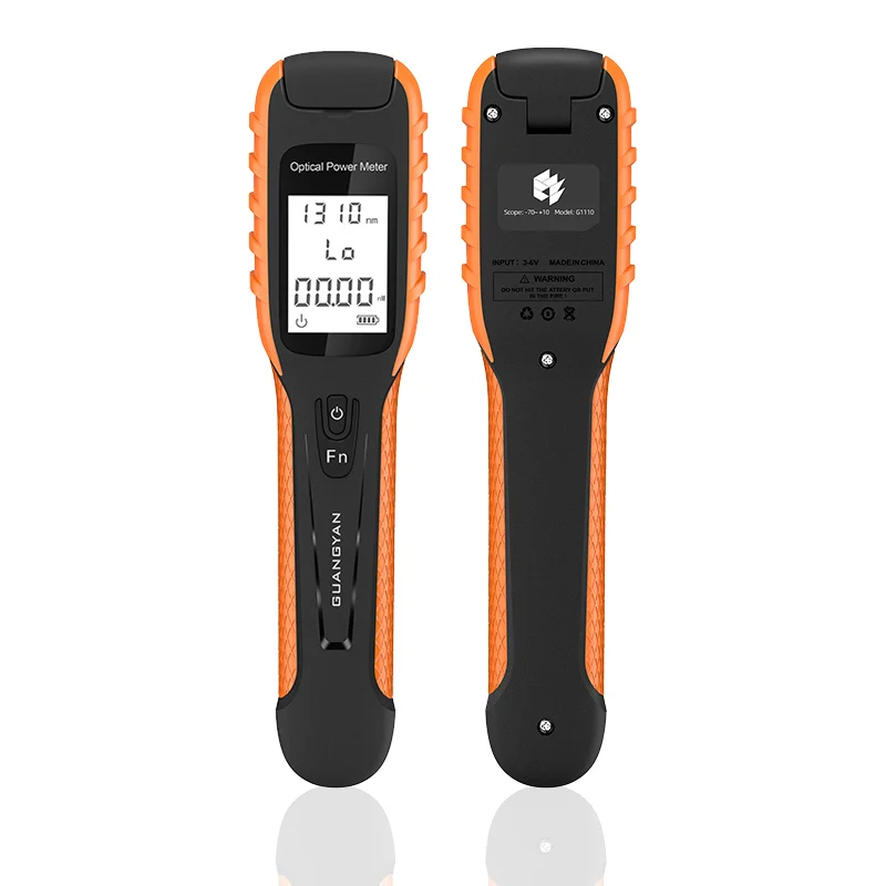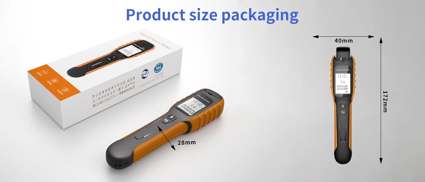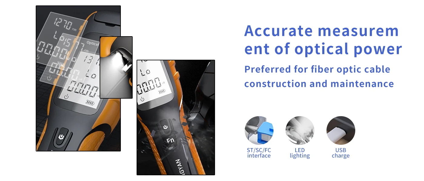 The multifunctional optical power detector offers support for 9 wavelengths, including the new 5G measurement wavelength. It features automatic wavelength recognition, intelligent memory, and a built-in LED flashlight for dark environments. With a durable, ergonomic design and USB charging, this device is perfect for various testing needs. It is equipped with a high-strength ABS plastic body, CNC integrated molding, and soft silicone grips for comfort and durability.