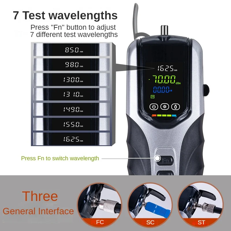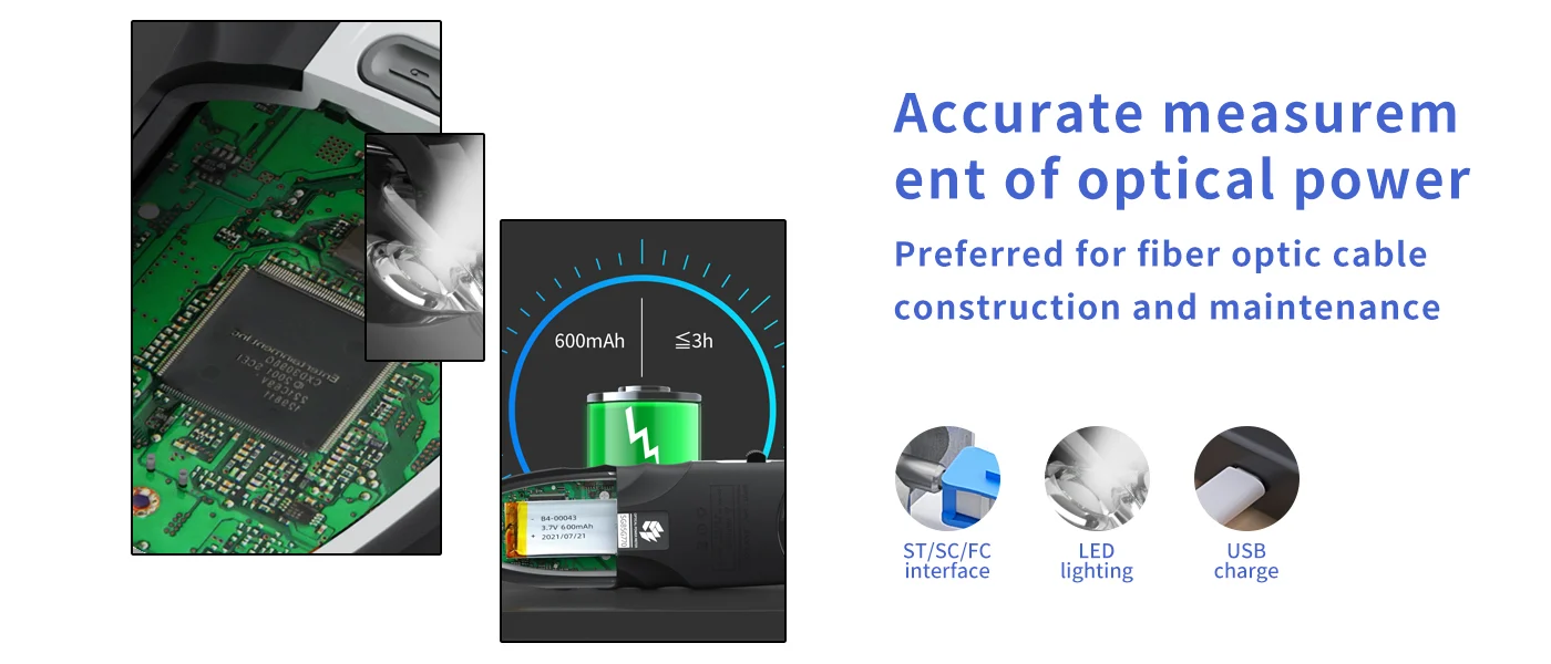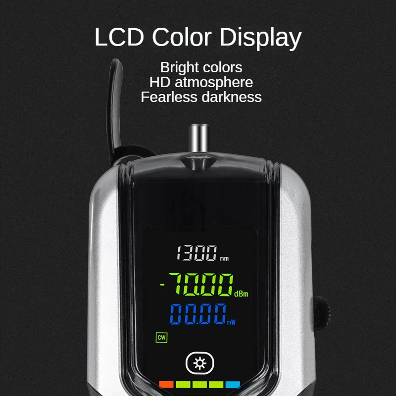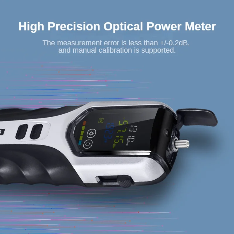 This Smart Optical Power Meter is equipped with a vivid LCD color screen for clear readings, designed for precise optical fiber signal testing in engineering and fieldwork. It supports multi-wavelength recognition, high-accuracy measurement, and features durable construction with ABS engineering plastic. With built-in USB charging, LED flashlight function, and a high-capacity lithium battery, it ensures efficient and reliable use in complex and dark environments.