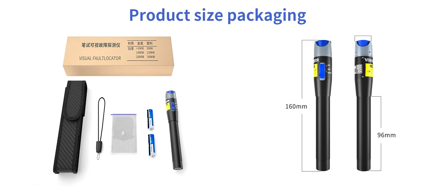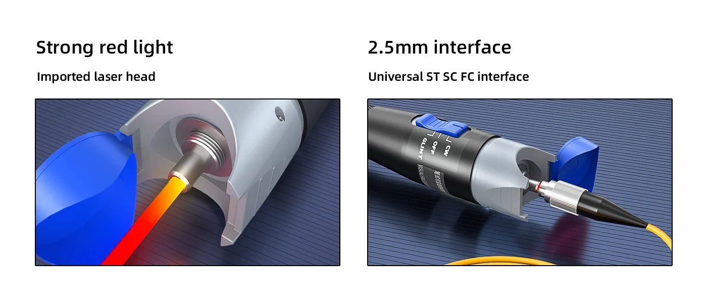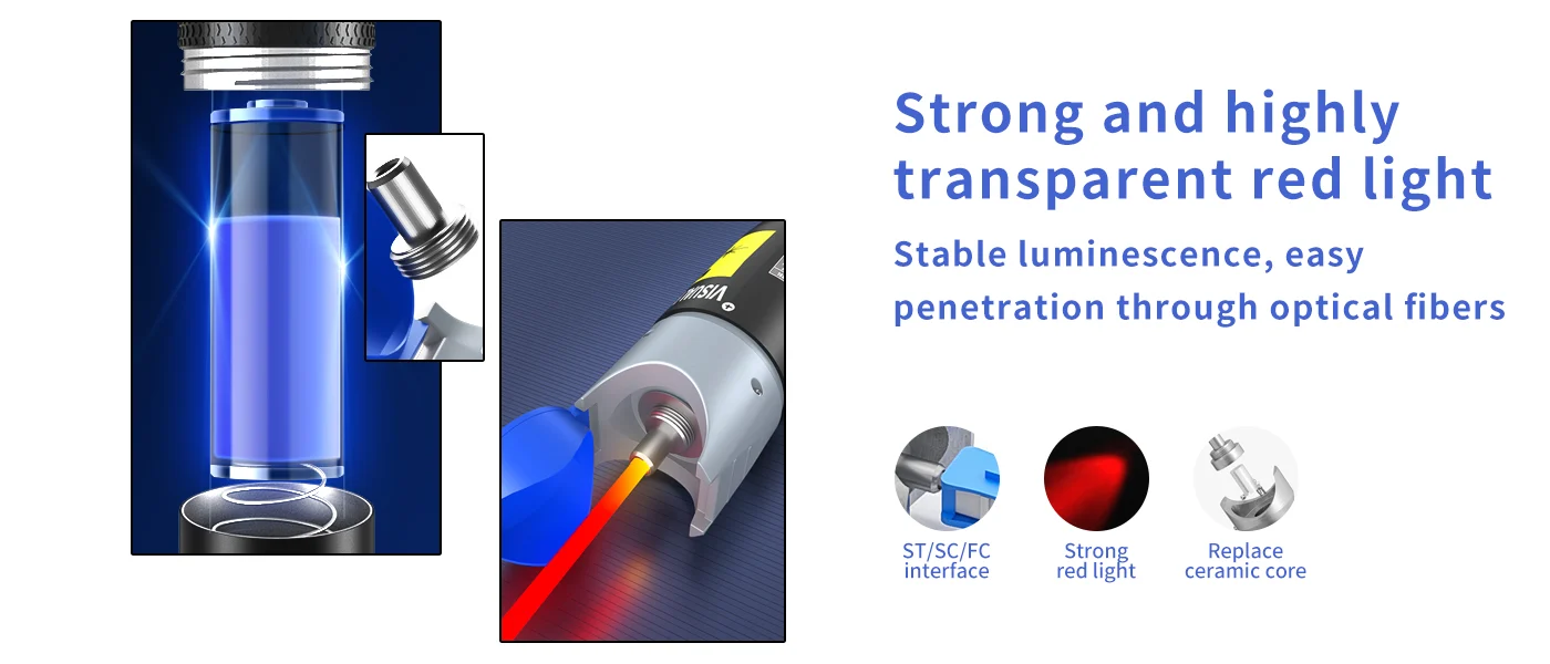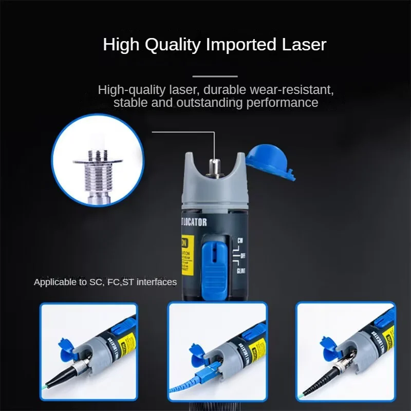A compact and powerful visual fault locator with strong light output, supporting multiple interfaces to efficiently detect fiber breakpoints from 1 to 30km. Designed for durability, ease of use, and portability.